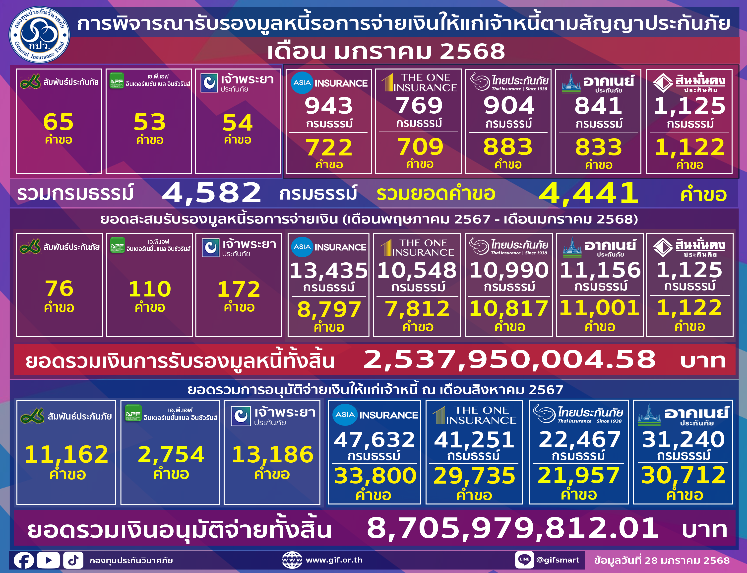 กองทุนประกันวินาศภัย ได้มีการพิจารณารับรองมูลหนี้รอการจ่ายเงินให้แก่เจ้าหนี้ตามสัญญาประกันภัย ประจำเดือนมกราคม 2568 โดยมีรายชื่อบริษัท ดังนี้